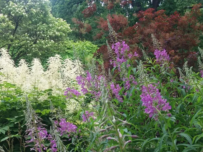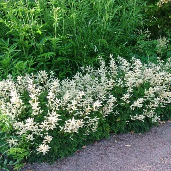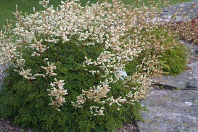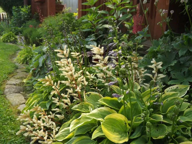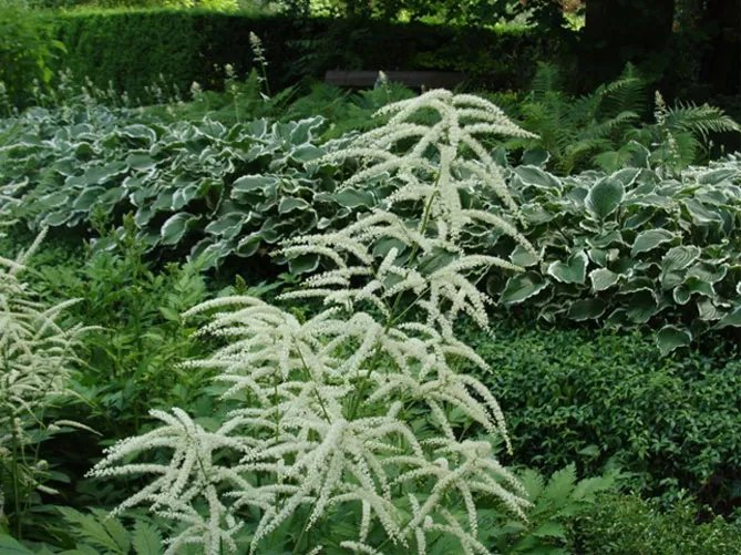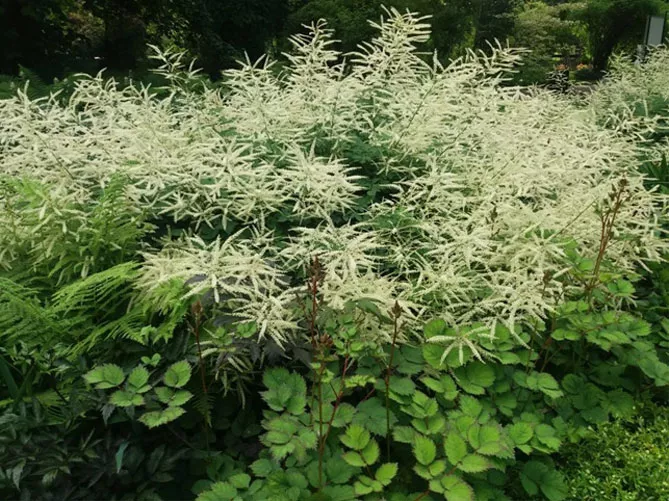 - Хорошо будет смотреться под большими деревьями – длинные кремовые или белые соцветия осветлят тенистые места, а листья и цветы заполнят пробелы под кронами деревьев.