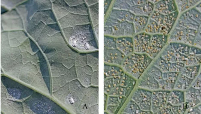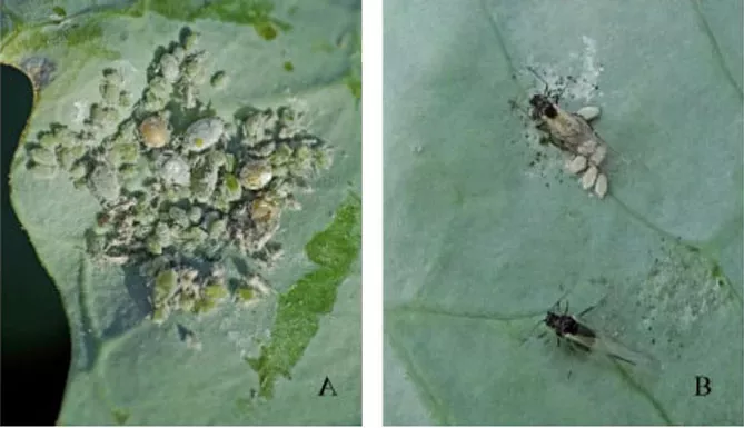 Фото. Капустная тля: А — колония, состоящая из бескрылых особей и личинок, Б – крылатые особи тли.