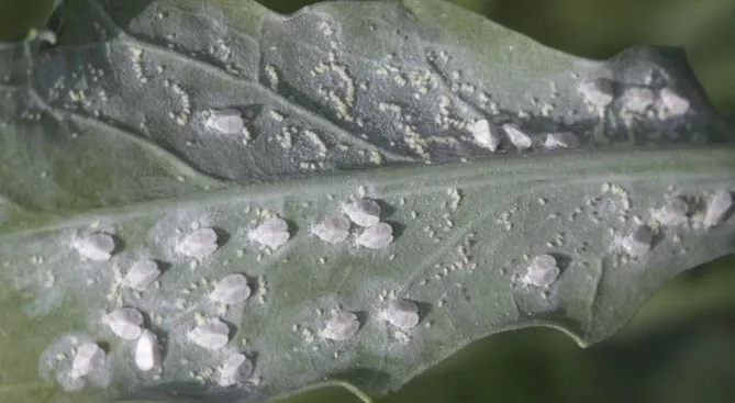 - Brevicoryne brassicae вызывает деформацию и порозовение листьев капусты.