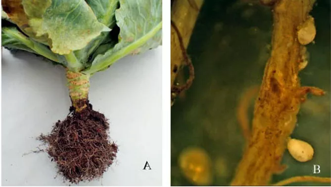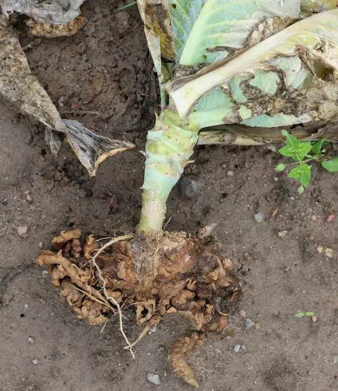 - Пораженная корневая система становится основным источником заражения почвы. Растения, подвергшиеся заражению на более поздней стадии роста, могут развить вторичную корневую систему (так как обладают способностью регенерировать корни, что позволяет капусте выжить и даже дать урожай).