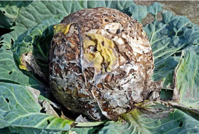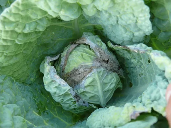 - Почернение листовых сосудов может распространяться по всему растению, вызывая почернение листьев с последующим быстрым распадом тканей. Зараженные бактериями кочаны не пригодны для хранения и засолки.