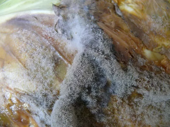 - При длительном хранении симптомы проявляются в виде обильного пушистого белого мицелиального нароста на пораженных кочанах.