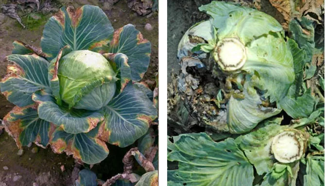 - Помимо пожелтения листьев капусты от болезни, характерным признаком является почернение проводящих сосудов, прогрессирующее вглубь растения, что и дало название заболеванию. На поперечном срезе кочана видны чернеющие слои листьев.