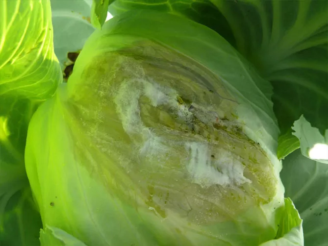 - Наибольшая вредоносность болезни на белокочанной капусте приходится на предуборочный период. В это время заболевание не оказывает прямого влияния на урожайность, но снижает лежкость кочанов.