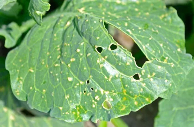 - Гусеницы старшего возраста прогрызают в листьях многочисленные, крупные отверстия неправильной формы.