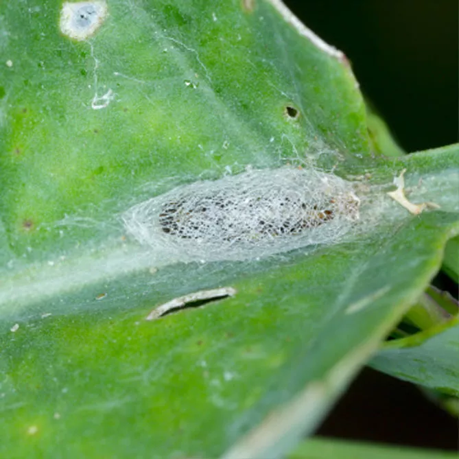 - Молодые гусеницы питаются сначала внутри листьев, более старые соскребают кожицу и мякоть листа, в результате образуются «окна». При высокой интенсивности поражения вредителем происходит полное уничтожение листьев.