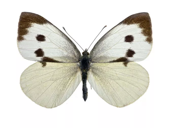 - Бабочки с размахом крыльев 55-70 мм, самки крупнее. Верхняя сторона крыльев белая с черным кончиком на передней паре, у самок видны 2 черных пятна сверху и снизу крыльев. Нижняя сторона задней пары крыльев светло-желтая с серым налетом, за исключением белого центра и основания передних крыльев.