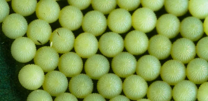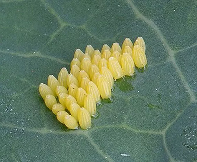 - Яйца бутылковидной формы, высотой 1,4 мм, ребристые, ярко-желтого цвета, перед вылуплением ярко-оранжевые, откладываются на листьях группами по 40-100 штук.