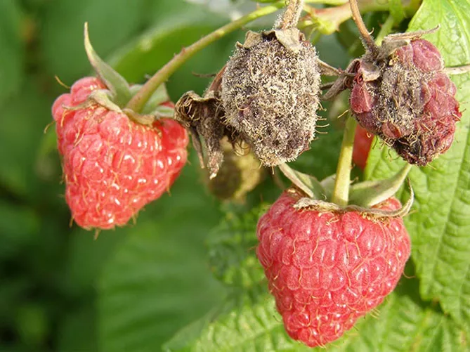 - На инфицированных ягодах малины болезнь проявляется пятнами гниения, на них появляется белый налет мицелия, который постепенно покрывается серым пыльным налетом, состоящим из спор конидий. Эти споры способствуют дальнейшим инфекциям, поэтому патоген быстро распространяется от инфицированного плода при контакте с другими частями растения.