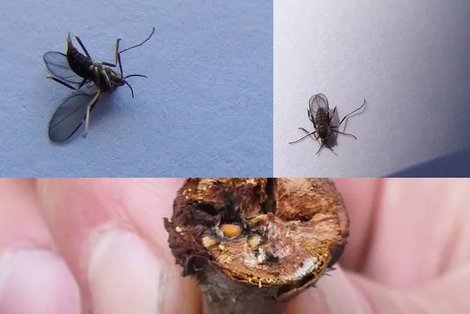 Очень маленькая муха галлица малинная (Lasioptera rubi) длиной 2,5 мм, темно-коричневая с серебристыми поперечными полосами на верхней стороне брюшка. Личинка оранжевого цвета, длиной 1,8-2,5 мм. Зимуют личинки в наростах на побегах малины. Окукливаются весной и летают с апреля по июнь.