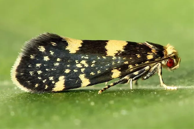 Коричнево-красная бабочка – малинная почковая моль (Incurvaria rubiella) – насекомое с размахом крыльев 12 мм.
