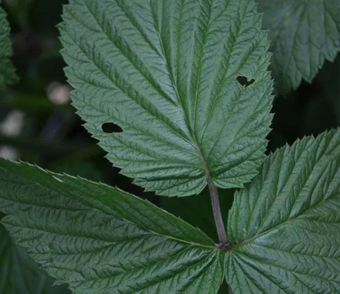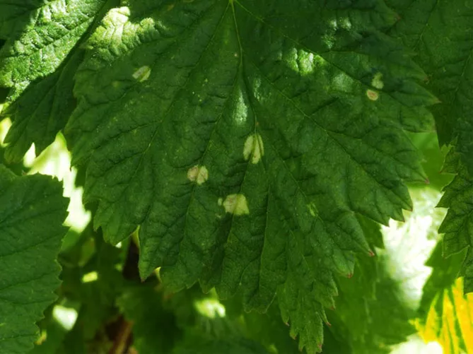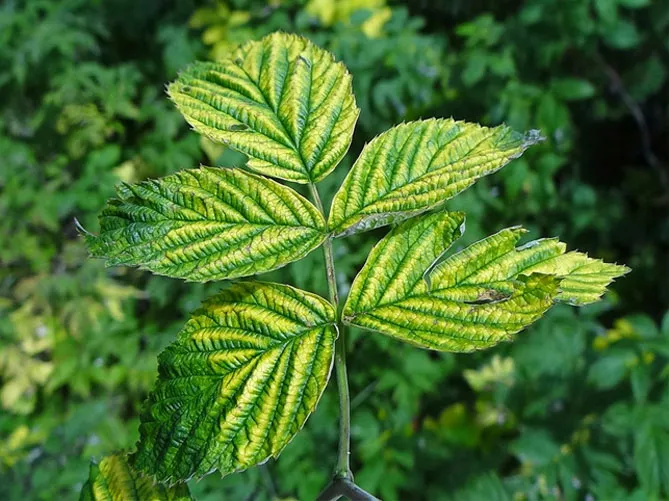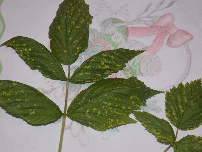 На фотографии представлены симптомы вертициллеза малины –небольшие желтоватые пятна неправильной формы между жилками листьев.