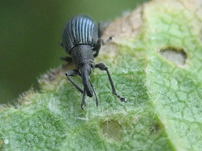 Черные жуки семейства долгоносиков под названием цветоед малинный (Anthonomus rubi) встречаются также на землянике, клубнике, ежевике.