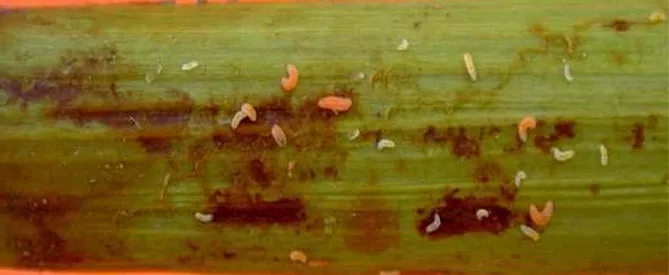 Розово-оранжевые личинки этой галлицы питаются корой малины, вызывая ее отслоения, побеги становятся коричневыми.
