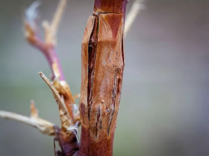 Кора отслаивается, в некоторых местах отстает от побега, создавая ворота для грибковых инфекций.