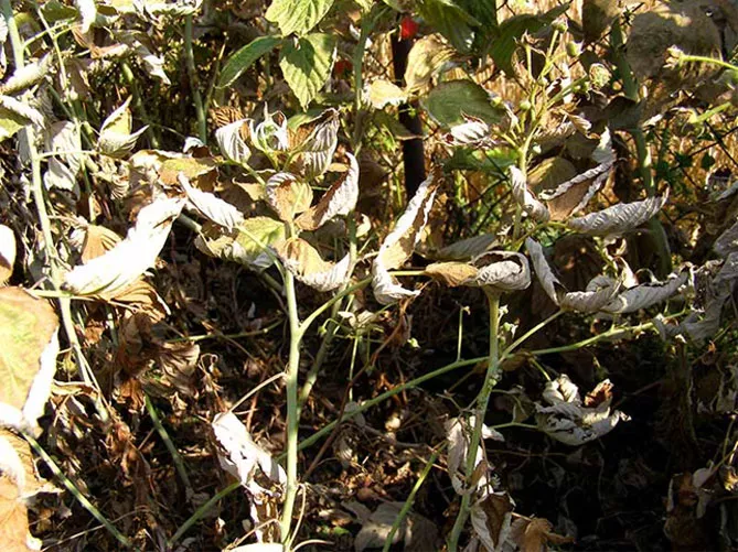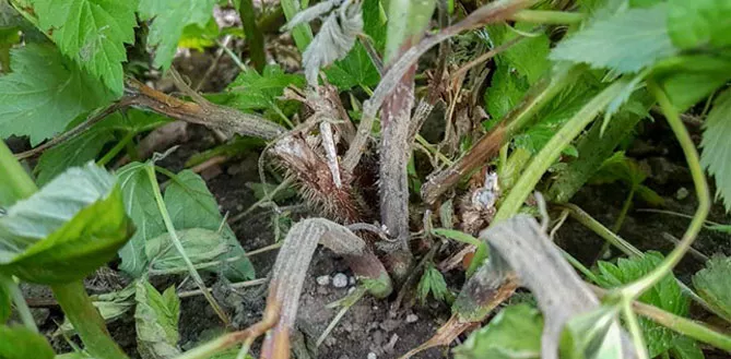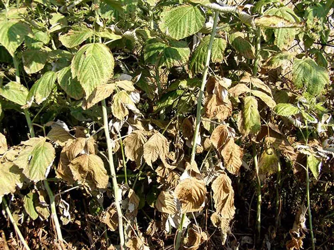 - Жаркий период в момент завязывания плодов способствует ускорению развития патогенов. Внезапно края листьев начинают подсыхать, побеги отмирают. Первоначальная диагностика усыхания побегов напоминает другое заболевание, называемое отмиранием побегов малины.