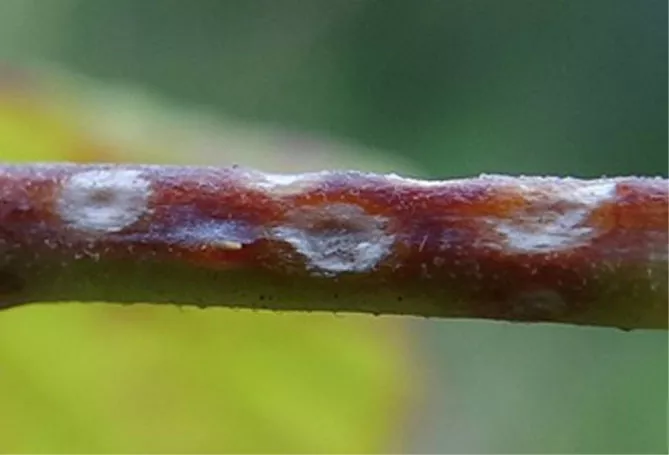 - Появление светло-коричневых пятен на побегах. Когда побег становится деревянистым, ткань в пятнах становится серой, отслаивается. Пораженные побеги плохо растут, имеют пониженную морозостойкость.