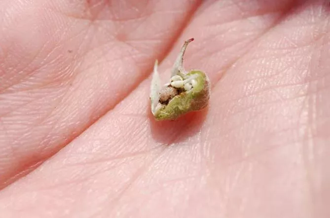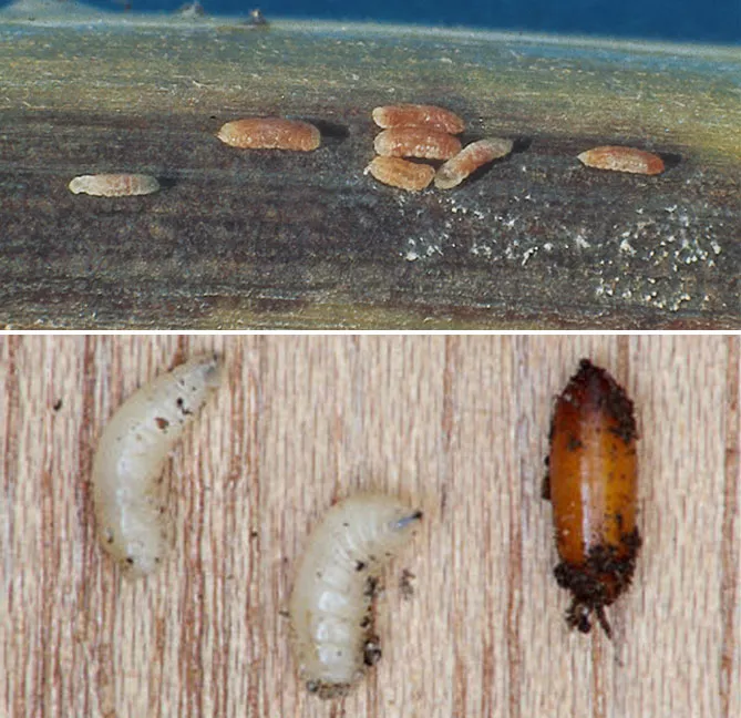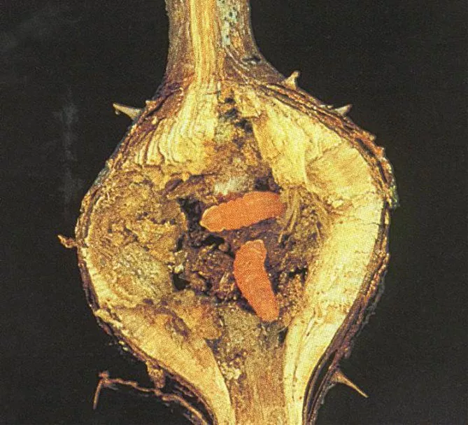 - Самки откладывают яйца в распустившиеся цветочные почки, затем подгрызают стебли ниже бутонов.
