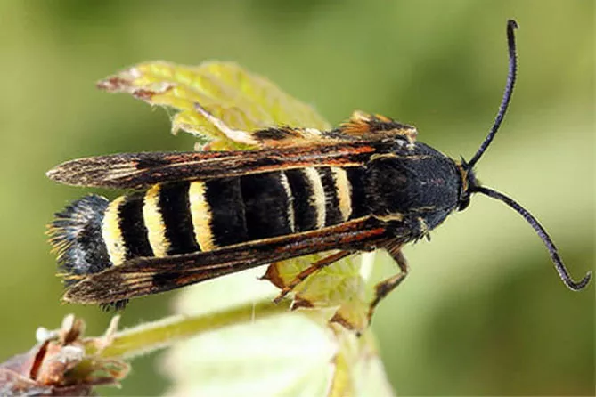 Бабочка стеклянница малинная (Pennisetia hylaeiformis) отличается прозрачными крыльями и темно-синим телом. Хотя взрослые особи относятся к отряду бабочек, они не похожи на типичных представителей этого отряда. Брюшко бабочки напоминает насекомое из семейства ос, потому что на брюшке есть желто-черные кольца. Брюшко самца отделано щеточкой из желтых волосков. Крылья бабочки прозрачные, с коричневым рисунком.