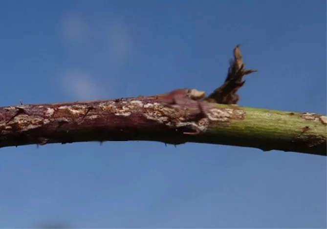 - Первые симптомы – темные пурпурно-коричневые пятна у основания листьев и вокруг почек, появляющиеся летом, обычно в июне.