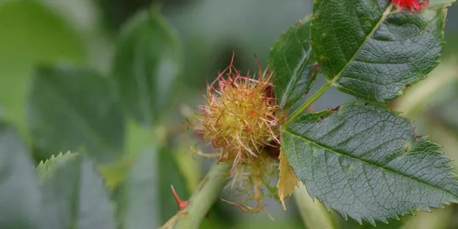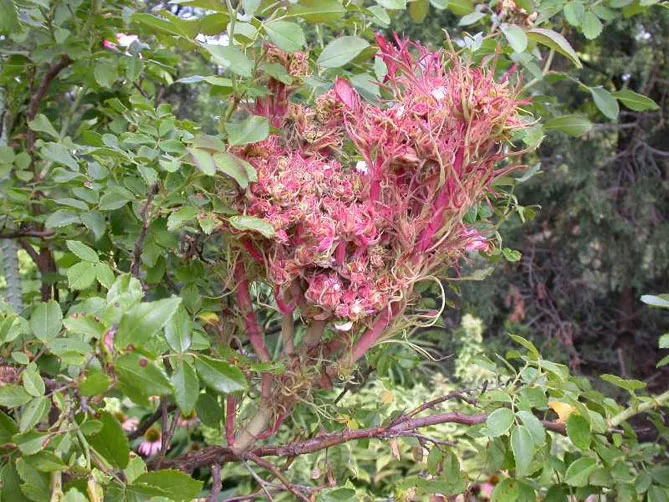 Мелкое насекомое из отряда перепончатокрылых Розанная орехотворка или диплолепис розанный (diplolepis rosae) откладывает яйца в ткани роз, вызывая образование галлов. Взрослая особь – насекомое длиной 5 мм, черноватого цвета, с сужающимся к спине брюшком. Ноги желтые или красноватые. Самка откладывает яйца в мае, зарывая в ткани растения. Личинки беловатого цвета развиваются внутри галла, который обеспечивает их питанием. Следующей весной вылупляются взрослые особи. Удалите пораженные части растений, не добавляйте их в компост.