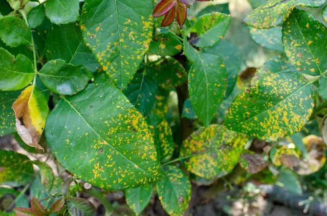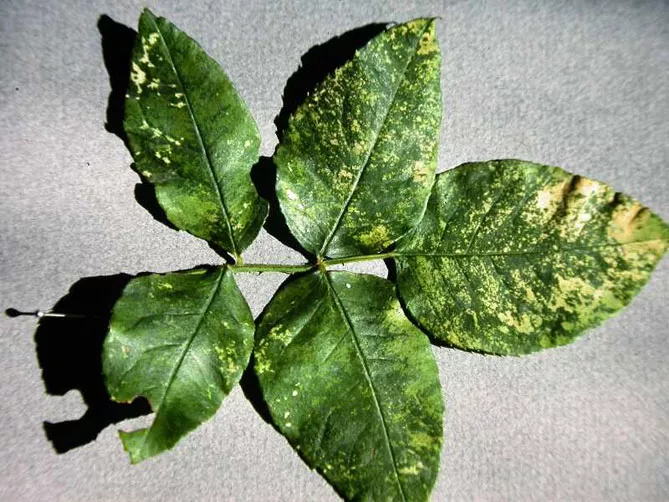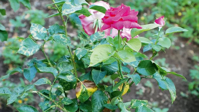 В начале лета нередко можно увидеть пятна на листьях, признак заражения вирусом мозаики. Вирус проникает в клетки и постепенно распространяется в растении. После заражения куст невозможно вылечить. Симптомы этой вирусной болезни роз различаются по степени тяжести: они могут варьироваться от обесцвечивания листьев до появления ярко выраженных желтых отметин.