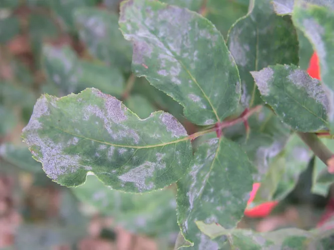 Самые первые симптомы не очень заметны и проявляются легким изменением цвета под листьями. Затем листья, бутоны и стебли покрываются пыльно-белым налетом, который расползается и утолщается. Пораженные листья деформируются, закручиваются вокруг средней жилки. Бутоны не могут полностью раскрыться. Этот гриб может сохраняться зимой на ветках, у основания шипов или почек.