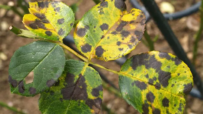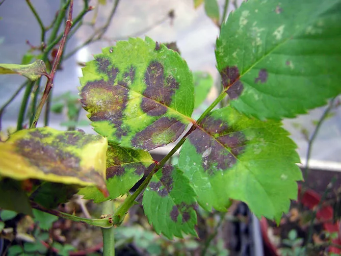 Симптомы: листья покрыты сверху круглыми черными пятнами с резкими очертаниями, отделенными друг от друга. Диаметр пятен составляет примерно 1-1,5 см. Несколько пятен могут объединяться, образуя большие черные пятна на листве зараженных роз. Остальная часть листовой пластины может желтеть полностью или только вокруг пятен. В жаркую влажную погоду по мере развития грибка пятна распространяются, листья желтеют, со временем опадают.