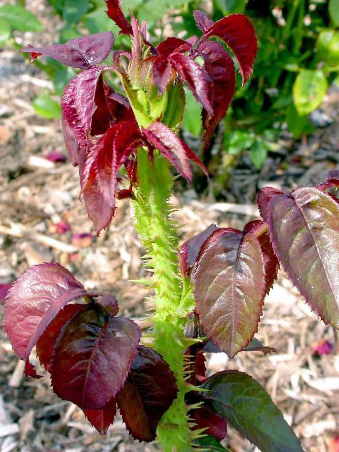 Дополнительные признаки: пролиферация цветка (поражает цветки, а не листву и стебли), новый рост побега (часто ярко-красный, но без пролиферации бутонов и шипов, с твердыми, а не мягкими стеблями).