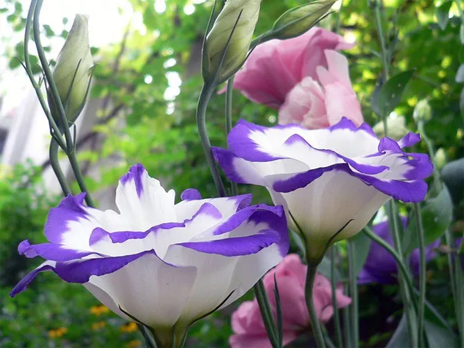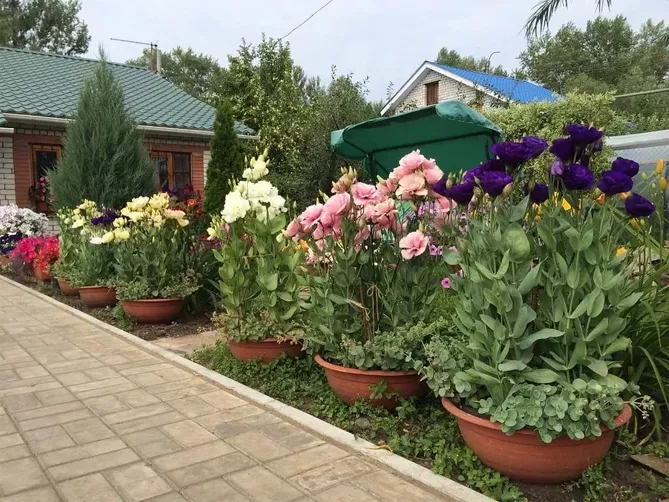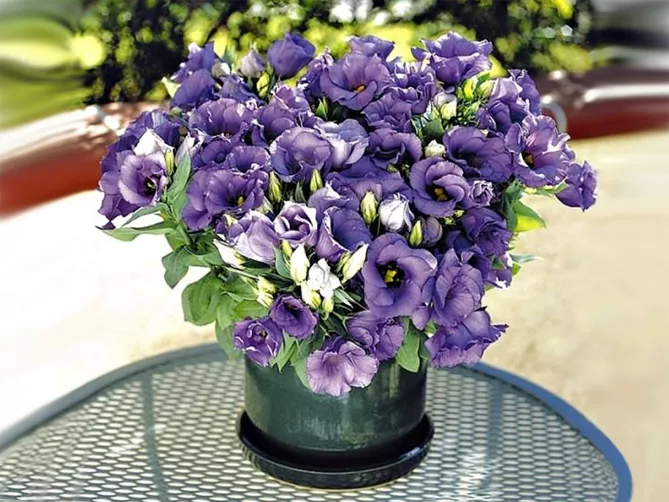 Летом горшки с эустомой можно выставлять на балкон, улицу, в сад. Их неоспоримое преимущество – универсальность. Они прекрасно сочетаются практически со всеми садовыми растениями, цветами. Деревянный горшок с эустомами красиво смотрится на деревянной раме балкона с вьющимися сортами роз. Можно посадить их в компании с маленькими мышиными гиацинтами или большими мартагонскими лилиями. Эустома фиолетовая хорошо смотрится рядом с ирисами, в компании ампельной бегонии, сурфинии.