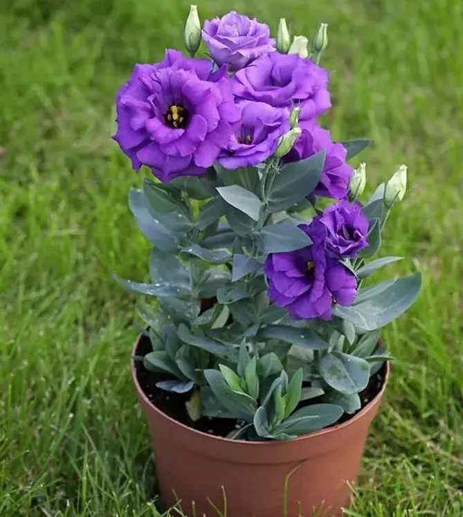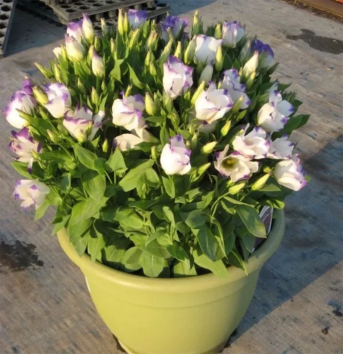Первоначально цветок эустомы выглядит как типичное декоративное растение в горшке – у него красивые серо-зеленые листья и даже вне периода цветения он выглядит красиво. Молодой экземпляр начинает цвести только в следующем вегетационном периоде после посадки в горшок. Цветы обычно появляются в июле-августе. Одно горшечное растение может произвести много цветов, тогда горшок выглядит как плотный, красивый букет невесты.