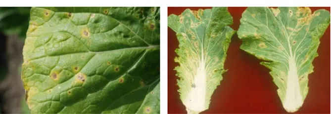 Патогенные микроорганизмы чаще всего поражают самые старые листья капусты, на которых появляются пятна темного цвета разных размеров, обычно окруженные желтоватой каймой. Поверхность пятен, в условиях высокой влажности, покрывает бархатистый темно-коричневый налет конидиальных спор. Сильно зараженные листья желтеют и высыхают. Наиболее распространенными источниками патогенов являются растительные остатки после сбора урожая в почве и зараженные сорняки из семейства Brassicaceae.