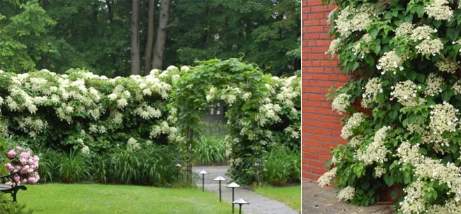 Гортензия – цветущий, многолетний, сильнорослый вьюн родом из Китая. Вырастает до 8 метров. Как плющ, многолетняя гортензия прикрепляется к опорам воздушными корнями. Листья темно-зеленые, желтеют осенью. Основное украшение растения – белые мелкие цветки, собранные в крупные (диаметром до 25 см), плоские соцветия. Цветение продолжается на рубеже июня-июля.
