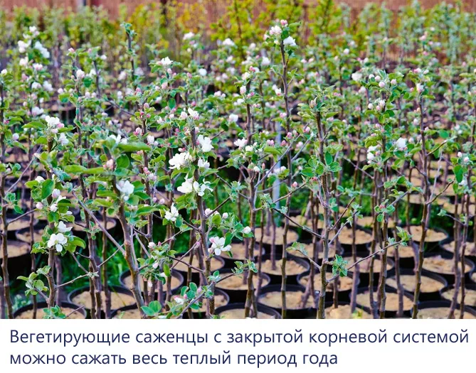 Посадку яблонь производят весной и осенью. Весной сажать следует во второй половине апреля, но предпочтительной считается именно осенняя посадка. Проводят ее на солнечных участках в сентябре-октябре. Саженцы яблонь выбирают с хорошо развитой корневой системой. Расстояние между деревьями следует делать не менее 5 м.
